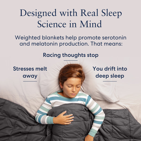 The weight of this blanket is designed to provide the sensation and comfort of a warm hug to help you fall asleep faster and stay asleep longer. This occurs when your body releases serotonin and melatonin while in the comfortable cocoon of our weighted blanket. The weight naturally stimulates your body’s biochemistry to induce a calming effect.