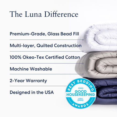 Luna weighted blankets combine cloud-like, breathable cotton with superior Deep Pressure Touch stimulation beads. The weight of this blanket is designed to provide the sensation and comfort of a warm hug to help you fall asleep faster and stay asleep longer. This occurs when your body releases serotonin and melatonin while in the comfortable cocoon of our weighted blanket. The weight naturally stimulates your body’s biochemistry to induce a calming effect.